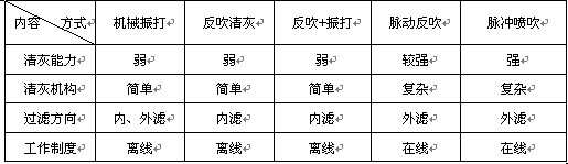 清灰方式是決定袋式除塵器性能的一個(gè)重要因素。以清灰方式對(duì)袋式除塵器進(jìn)行分類,基本型式主要有:機(jī)械振打清灰方式、反吹清灰方式反吹、振打聯(lián)合清灰方式、脈動(dòng)反吹清灰方式、脈沖噴吹清灰方式。低壓脈沖袋式除塵器屬于脈沖噴吹清灰方式。